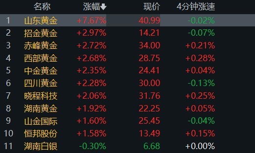 二级市集上,贵金属板块也同步走强,其中,山东黄金涨超7%,招金黄金、赤峰黄金、中金黄金、西部黄金跟涨。